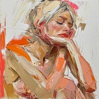 "Een contemplatieve verstilling in olieverf," is een digitaal schilderij van René van den Berg, waarbij de kunstenaar speelt met dikke, expressieve verfstreken in een palet van crème, koraalroze en vurig oranje tegen een serene witte achtergrond. De vrouwelijke figuur is in gedachten verzonken, haar hoofd rustend op haar handen, een houding die een moment van introspectie en rust oproept. De stijl van het werk doet denken aan het expressionisme, waarbij de emotie en persoonlijke beleving vooropstaan, geuit in de losse, bijna abstracte toepassing van verf. De titel van dit werk zou "Moment van Bezinning" kunnen zijn.