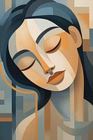 Een abstract portret van een vrouw, weergegeven in een minimalistische stijl met zachte tinten blauw, beige en oranje. Haar silhouet is subtiel en gestileerd, waardoor het werk een mysterieuze en serene uitstraling krijgt. Dit moderne kunstwerk combineert vrouwelijke elegantie met geometrische vormen en is ideaal voor interieurs die rust en verfijning uitstralen. Perfect voor liefhebbers van abstracte kunst, vrouwelijke portretten en eigentijdse wanddecoratie.