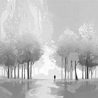 Rustig abstracte weergave van een bos met een silhouet van een persoon aan het einde van het bospad. Weergegeven in neutrale beige tinten.