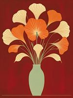 Verhoog je ruimte met deze fascinerende en moderne kunstprint met een gestileerd boeket abstracte bloemen. Het ontwerp toont radiale bloemblaadjespatronen die doen denken aan ginkgobladeren, gepresenteerd in een levendig palet van oranje- en crèmetinten. De bloemen zijn elegant gerangschikt in een eenvoudige, lichtgroene vaas, die een sereen contrast vormt met de gedurfde en dramatische rode achtergrond. Dit stuk is een perfecte mix van natuurlijke vormen en grafisch ontwerp en biedt een verfijnde en tijdloze esthetiek. De rijke kleuren en unieke compositie maken het een prachtig middelpunt voor elke kamer, van een eigentijdse woonkamer tot een bohemien-geïnspireerde slaapkamer. Deze print geeft een gevoel van moderne elegantie en artistieke flair, waardoor het een ideale keuze is voor mensen die houden van botanische thema's met een unieke, gestileerde twist.