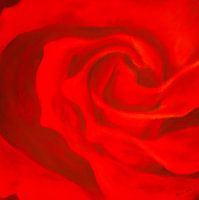 Abstract red 3 - Rose is een acrylschilderij in vierkant formaat met de hand geschilderd door de kunstenaar Karen Kaspar. De binnenkant van een prachtige rozenbloesem ontvouwt zich in een spiraalvorm in sterke rode tinten.