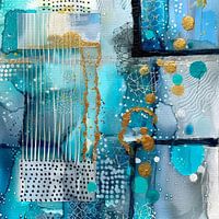 Abstract schilderij met voornamelijk tinten blauw, wit en goud. Mooie textuur en patronen. In de kleuren van vakantie en de mooiste Griekse eilanden, blauw en wit. De focus ligt op visuele elementen zoals kleuren, vormen en texturen, wat ruimte biedt voor persoonlijke interpretatie. Dit kunstwerk zou goed passen in een moderne of hedendaagse woonstijl vanwege de abstracte aard en het gebruik van gedurfde grafische elementen.