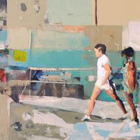 Abstract schilderij "Dwalen in de stad" in pastelkleuren. Dit werk is onderdeel van een vierluik, maar ieder werk is ook apart sterk. Aan jou de keus. Om de andere werken te zien, typ je in de zoekbalk de titel "Dwalen in de stad". Stedelijk landschap met passanten.