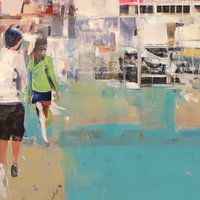 Abstract schilderij "Dwalen in de stad" in pastelkleuren. Dit werk is onderdeel van een vierluik, maar ieder werk is ook apart sterk. Aan jou de keus. Om de andere werken te zien, typ je in de zoekbalk de titel "Dwalen in de stad". Stedelijk landschap met passanten.