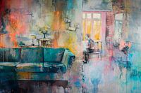 Abstract schilderij van een interieur met een persoon die aan een bureau bij een raam zit. Het gebruik van kleur en penseelstreken geeft het een dromerige, etherische kwaliteit. Op de voorgrond van het schilderij zien we een bank in een woonkamer met schilderijen. De muren zijn bedekt met lagen verf in verschillende kleuren die samen een spel van licht en schaduw creëren.
