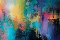 Abstract schilderij met een mix van levendige kleuren en texturen. De sfeer van het schilderij is dynamisch en energiek door de heldere kleuren.