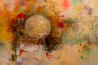 Abstract schilderij met een mix van kleuren, texturen en vormen. Een planeet die doet denken aan de maan in een dromerige, etherische sfeer.