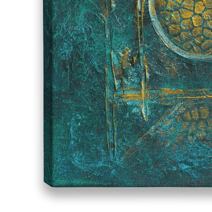 Trefwoorden: Abstract, Textuur, Geometrisch, Organisch, Impasto, Groen, Blauw, Goud, Mystiek