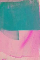 Abstract contemporary art werk in groene en roze pastelkleuren. Door de toepassing van verschillende lagen ontstaat er een interessante compositie met de kleuren van 2023.