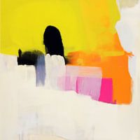 Abstract schilderij in geel, zwart, oranje, wit en roze. Contemporary art.
