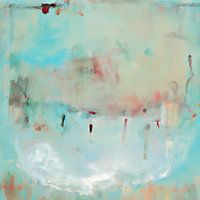 Abstract schilderij in voornamelijk wit en fris lichtblauw met een snufje rood en zwart. Pastel kleuren zorgen voor een fijne lentesfeer.