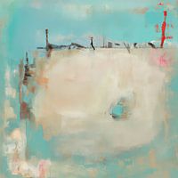 Abstract schilderij in voornamelijk wit en fris lichtblauw met een snufje rood en zwart. Pastel kleuren zorgen voor een fijne lentesfeer.