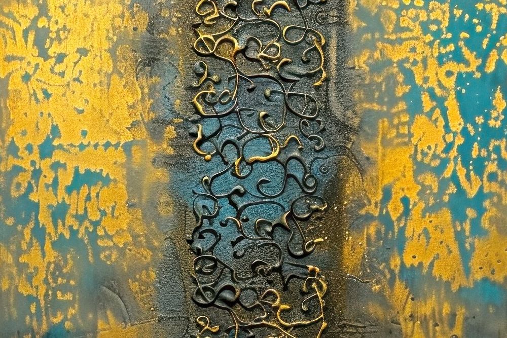 Kleuren: goud, blauw en teal.