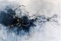 Abstract schilderij met een mix van koele en neutrale tinten, voornamelijk in blauw, wit, zwart en een vleugje goud. De penseelstreken zijn dynamisch en creëren een gevoel van beweging. Het schilderij heeft een rustige en serene sfeer uit door het gebruik van koele kleuren en vloeiende vormen. Het roept een gevoel van kalmte op, maar heeft ook een element van mysterie.