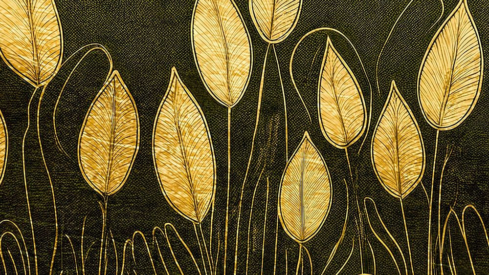 De kleuren zijn diep en luxe: de achtergrond is een donkere olijfgroen met een subtiele textuur of glans die diepte geeft. De grassen, stelen en bladeren zijn uitgevoerd in verschillende tinten goud en oker, wat een warm, lichtgevend contrast creëert met de donkere achtergrond.