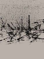 Abstract en modern schilderij met zwarte penseelstreken en texturen die de aandacht trekken.