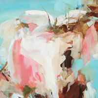 Abstract schilderij pastel in zachte, frisse kleuren met een klein snufje warmere kleuren. Roze, lichtblauw, wit en een heel klein beetje rood bruin en groen. Modern abstract contemporary, lente sfeer.
