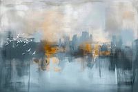 Dit abstracte schilderij toont een serene en etherische weergave van een stedelijk landschap met een reflectie op het water. De kleuren die gebruikt werden zijn een combinatie van zachte grijstinten, wit, en accenten van goud en zwart. De techniek is los en vloeiend met zichtbare penseelstreken, wat bijdraagt aan het dromerige effect.  Het schilderij straalt rust en kalmte uit en zou goed passen in een modern, minimalistisch interieur of in ruimtes bedoeld voor reflectie en ontspanning, zoals een woonkamer of een kantoor.