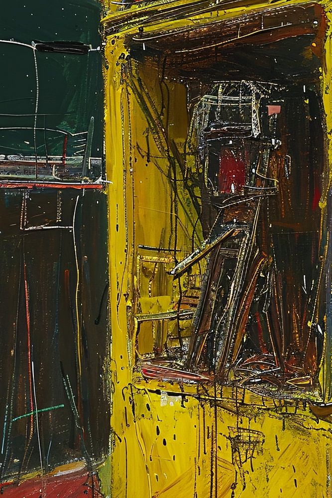 Dit dynamische en kleurrijke schilderij vangt de essentie van moderne kunst met een abstract expressionistische stijl. Het centrale thema is een geel hokje vol met gereedschap, weergegeven in een chaotisch en toch boeiend patroon. De krachtige penseelstreken en levendige kleuren zoals geel, rood, zwart, groen en bruin brengen energie en beweging in het ontwerp, waardoor het een perfecte aanvulling is voor elke eigentijdse woonkamer of kantoorruimte. Dit unieke kunstwerk roept emoties op en zorgt voor een levendige sfeer in elke ruimte, ideaal voor liefhebbers van moderne en abstracte kunst.