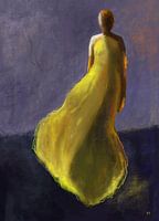 Mooi modern schilderij met veel kleur van een vrouw in een zwierige jurk. Abstract schilderij van een vrouw. Clair obscur van een vrouw. Mooie lichtval op de jurk van een vrouw. Fantasie schilderij van een vrouw met gele en paarse tinten.