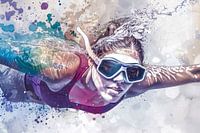 Abstract schilderij van een onderwater zwemmer. Het schilderij straalt een dynamische en moderne sfeer uit door zijn abstracte aard en het gebruik van heldere, contrasterende kleuren. Dit schilderij kan een vleugje creativiteit en energie toevoegen aan een interieur. Het past goed binnen een eigentijdse of moderne interieurstijl die gedurfde accenten en artistieke uitdrukkingen omarmt.