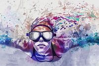 Abstract schilderij van een onderwater zwemmer. Het schilderij straalt een dynamische en moderne sfeer uit door zijn abstracte aard en het gebruik van heldere, contrasterende kleuren. Dit schilderij kan een vleugje creativiteit en energie toevoegen aan een interieur. Het past goed binnen een eigentijdse of moderne interieurstijl die gedurfde accenten en artistieke uitdrukkingen omarmt.