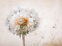 Aquarel in Mixed Media van een uitgebloeide paardenbloem met pluizenbollen in natureltint op een structuur achtergrond.
