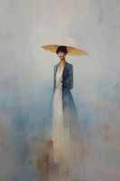 abstract schilderij, vrouw met paraplu schilderij, schilderij in blauwtinten, dromerige kunst, figuratief schilderij, kunst vrouw, schilderij blauw beige, minimalistische kunst, kunstwerk elegantie, schilderij rust