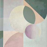 Dit minimalistische kunstwerk maakt indruk met zijn harmonieuze compositie van geometrische vormen en zachte pastelkleuren. De zachte roze, beige en groene tinten creëren een rustgevende en elegante sfeer, terwijl de strakke lijnen en cirkels het beeld een moderne en eigentijdse esthetiek geven. Ideaal voor stijlvolle woonruimtes, kantoren of creatieve werkruimtes die op zoek zijn naar een subtiele maar indrukwekkende wanddecoratie. Dit kunstwerk brengt rust en verfijning in elke omgeving.
