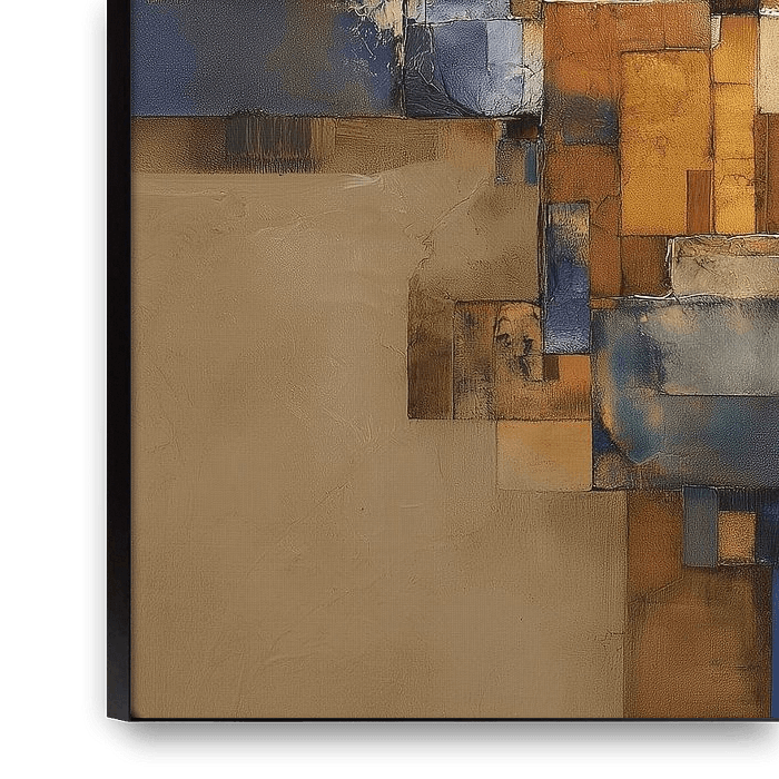 Abstract schilderij - Dit abstract schilderij ademt tegelijk stilte en stedelijke ritmiek. In één blik voel je hoe licht en structuur met elkaar spelen: brede, vlakke vlakken in diepe blauwtonen zetten zich af tegen warme, goud-oker en bruine blokken, alsof een horizon in stukjes is gebroken en opnieuw is gelegd. Het werk is een modern…