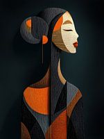 Een portret van een Aziatische vrouw, met een minimalistisch en eenvoudig ontwerp tegen een donkere achtergrond. Het kunstwerk bestaat uit papier met textuur en gelaagde elementen. De afbeelding toont een harmonieuze mix van gedurfde oranje, zwarte en beige tinten, met ingewikkelde textuurpatronen in het haar en de kleding tegen een diepe, contrasterende achtergrond.
