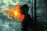 Dit abstracte kunstwerk toont het silhouet van een persoon bij een raam, verlicht door een oranjekleurig tegenlicht. De delicate omtrek van de figuur versmelt met de warme gloed van het achtergrondlicht. De scène brengt een sfeer van contemplatie en intimiteit over, terwijl de abstracte voorstelling ruimte laat voor individuele interpretatie. Het oranje lamplicht vormt een subtiel contrast met het donkere silhouet en creëert een expressieve stemming. Dit kunstwerk nodigt je uit om de grenzen tussen vorm en abstractie te verkennen terwijl je een sereen en betoverend momentopname maakt.