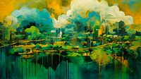 Dit abstracte kunstwerk van een stadspark met groene en gouden tinten is een visuele viering van zowel de natuur als de menselijke creativiteit. Het nodigt de toeschouwer uit om verder te kijken dan het oppervlak en om de diepere betekenis en emoties te verkennen die schuilgaan achter de levendige kleuren en vormen.