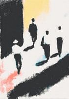 Dit abstracte schilderij toont vier mannen die van achteren op een diagonaal pad lopen. De figuren zijn afgebeeld als zwarte silhouetten zonder details en werpen lange schaduwen op het witte en lichtblauwe pad. De achtergrond is verdeeld in drie kleurvlakken: diepzwart links, lichtgeel in het midden en zachtblauw rechts. Zwarte lijnen…