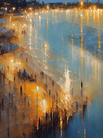 Betreed een abstracte dimensie waar kleuren dansen en vormen harmoniëren. Dit kunstwerk is geïnspireerd door een bruisende boulevard en zonovergoten strand.
