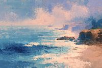 Een abstract olieverfschilderij toont een oceaanstrand met imposante kliffen in delicate pasteltinten blauw en roze. De zachte penseelstreken, zachte randen en natuurlijke materialen creëren een harmonieus, sfeervol effect. Geïnspireerd door de stijl van de Palos Strings, vangt het werk de rustige schoonheid van het kustlandschap.…