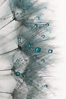 "Abstract turqouise en grijs: Een lijnenspel uit de natuur met druppels (verticaal)" is een macrofoto van turquoise druppels op de pluisjes van een paardenbloem.