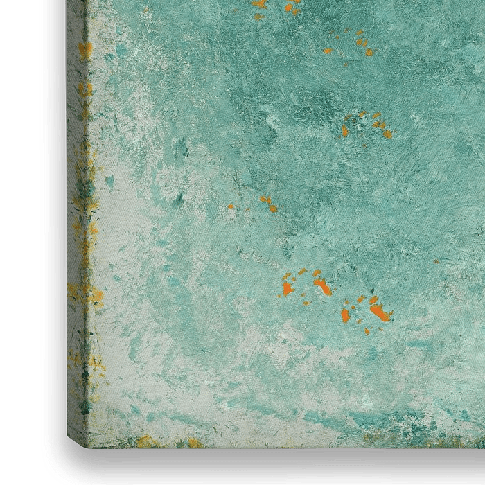 Een abstract schilderij met een prachtige textuur en kleurverloop. De turquoise kleur zorgt met de roestkleurige oranje tinten voor een interessant beeld. De contrasterende kleuren zorgen voor een spannend geheel.
