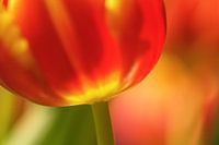 Uitsnede van een felgekleurde tulp tegen de achtergrond van andere tulpen.