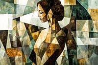 Dit abstracte kunstwerk toont een intrigerend portret van een vrouw in kubistische stijl. De warme tinten van bruin, goud en groen worden gecombineerd met subtiele zwart-witte accenten, wat een unieke sfeer creëert. Dit ontwerp past perfect in een modern interieur en voegt een vleugje verfijning en artistieke flair toe aan elke ruimte. Ideaal voor de slaapkamer of het kantoor, deze creatie is zowel decoratief als inspirerend. Laat je betoveren door de elegante lijnen en geometrische vormen die samen een prachtig visueel verhaal vertellen.
