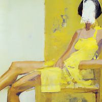 Abstract portret van een vrouw in geel. Als extra toevoeging gaf ik haar een witte streek door haar gezicht, waardoor ze volledig anoniem is. Ik houd ervan om een werk te maken dat vragen op roept zoals: wie is deze vrouw, wat doet ze daar, wat is haar gemoedstoestand? Op die manier raak je niet uitgekeken op een werk.