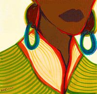 Een abstract vrouwenportret , het is een collage die bewerkt is met inktstiften. Haar blauwe oorbellen steken af tegen de groen gestreepte jurk . Haar gezicht en kraag zijn omlijst met zacht oranje wat een zonnige uitstraling geeft.