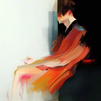 Abstract vrouwenportret met groot contrast in zwart, wit, rood, oranje, geel, roze en een tikje blauw. Contemporary art.