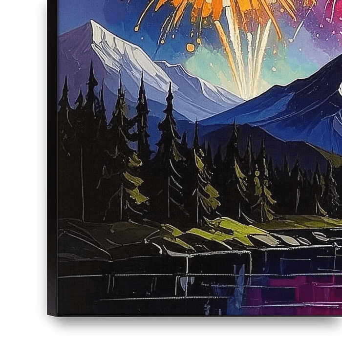 Koop dit landschapskunstwerk Abstract vuurwerk - Een nachtelijk spektakel van regenboogkleurige explosies boven een weerspiegelend meer, donkere bossen en torenhoge, met sneeuw bedekte bergen onder een hemel vol eruptieve lichtreflecties van AidasignArt op canvas, aluminium dibond, (ingelijste) fotoprint, behang en ArtFrame, op maat geprint in Fine-Art kwaliteit.