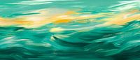 Hier ontvouwt zich een fascinerend samenspel van zachte golven en warme lichtreflecties, die de rust van de zee weergeven. De harmonieuze groene tinten en delicate gouden glans geven de kamer een rustgevende sfeer. Ideaal voor de woonkamer of slaapkamer, waar het ontspanning en mijmering bevordert.