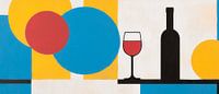 Sensuele kleuren en geometrische vormen nodigen je uit voor een gezellige avond. Een dieprood wijnglas, elegant vergezeld van een gestileerde fles, contrasteert harmonieus met levendige blauwe en gele cirkels. Dit kunstwerk is perfect voor in de keuken of woonkamer en maakt een uitnodigend statement tijdens het socializen.