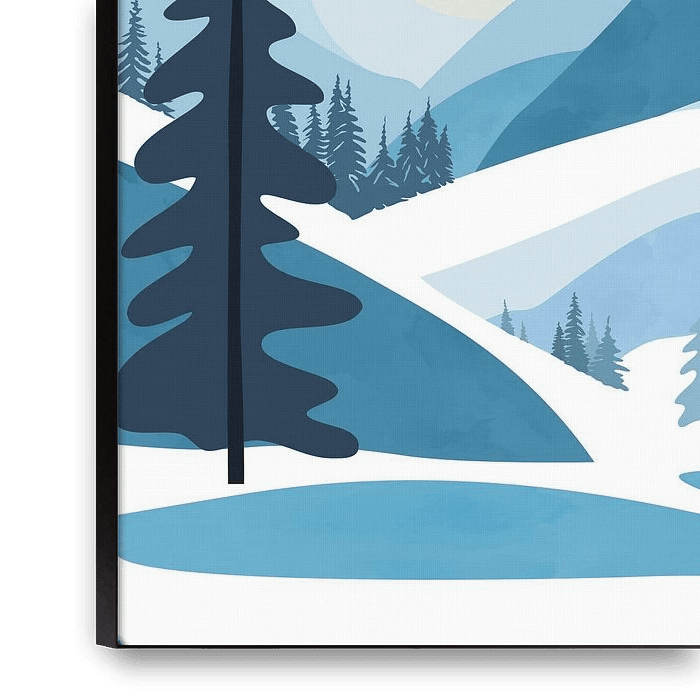 Abstract landschap met bomen, heuvels en bergen in de sneeuw. Het kleurenpalet omvat naast wit en grijs vooral gedempte tinten blauw, die de winter scène een vredige sfeer geven.