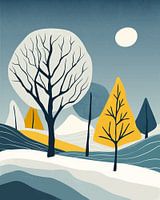 Abstract winterlandschap met bomen en velden in de nacht, met de maan boven alles. Het kleurenpalet omvat naast wit en grijs gedempte tinten blauw en goud-geel, die de scène een vredige sfeer geven.