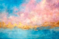 Abstracte schilderij toont een mooie mix van kleuren, waaronder blauw, roze en geel, die samen een dromerige en etherische sfeer creëren. De blauwe en roze tinten die in elkaar overvloeien creëren de wolken. De gouden horizon contrasteert mooi tegen de koelere tonen erboven en eronder. Onder de gouden horizon zien we de zee of een oceaan. Etherische en rustgevende sfeer.