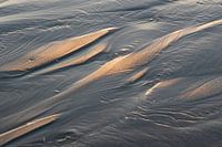 Tijdens de zonsondergang reflecteert het zonlicht op de patronen in het zand. Het maakt een abstract kleuren patroon van licht en donker, bruin, grijs en oranje. Dit was op het strand in Wijk aan Zee op een heerlijke zomeravond.